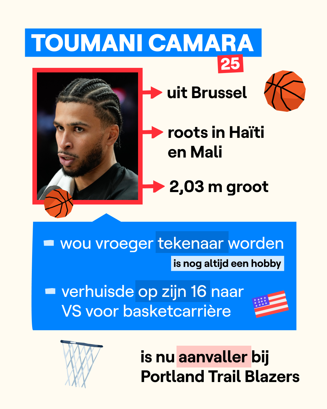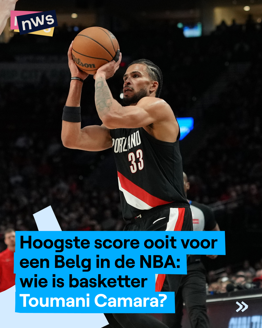 Toumani Camara heeft vannacht een topavond beleefd in de NBA. Da’s de hoogste basketcompetitie in Amerika. Camara scoorde maar liefst 35 punten voor zijn team en was de absolute uitblinker. Vooral zijn driepunters waren heel straf. Hij scoorde 9 van de 11 pogingen en begon zelfs met 8 op 8. Daarmee zette hij de beste prestatie ooit neer voor een Belg in de NBA. Zijn ploeg, de Portland Trail Blazers, won overtuigend met 134-99 van Brooklyn. Camara was na de match superblij: “Het voelde alsof ik niet kon missen”, klonk het. Swipe voor zotte driepunters!