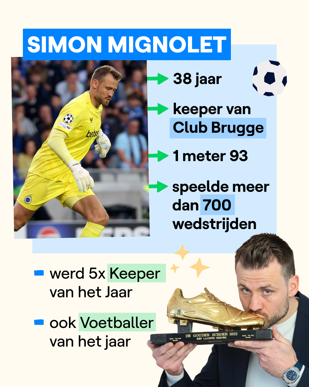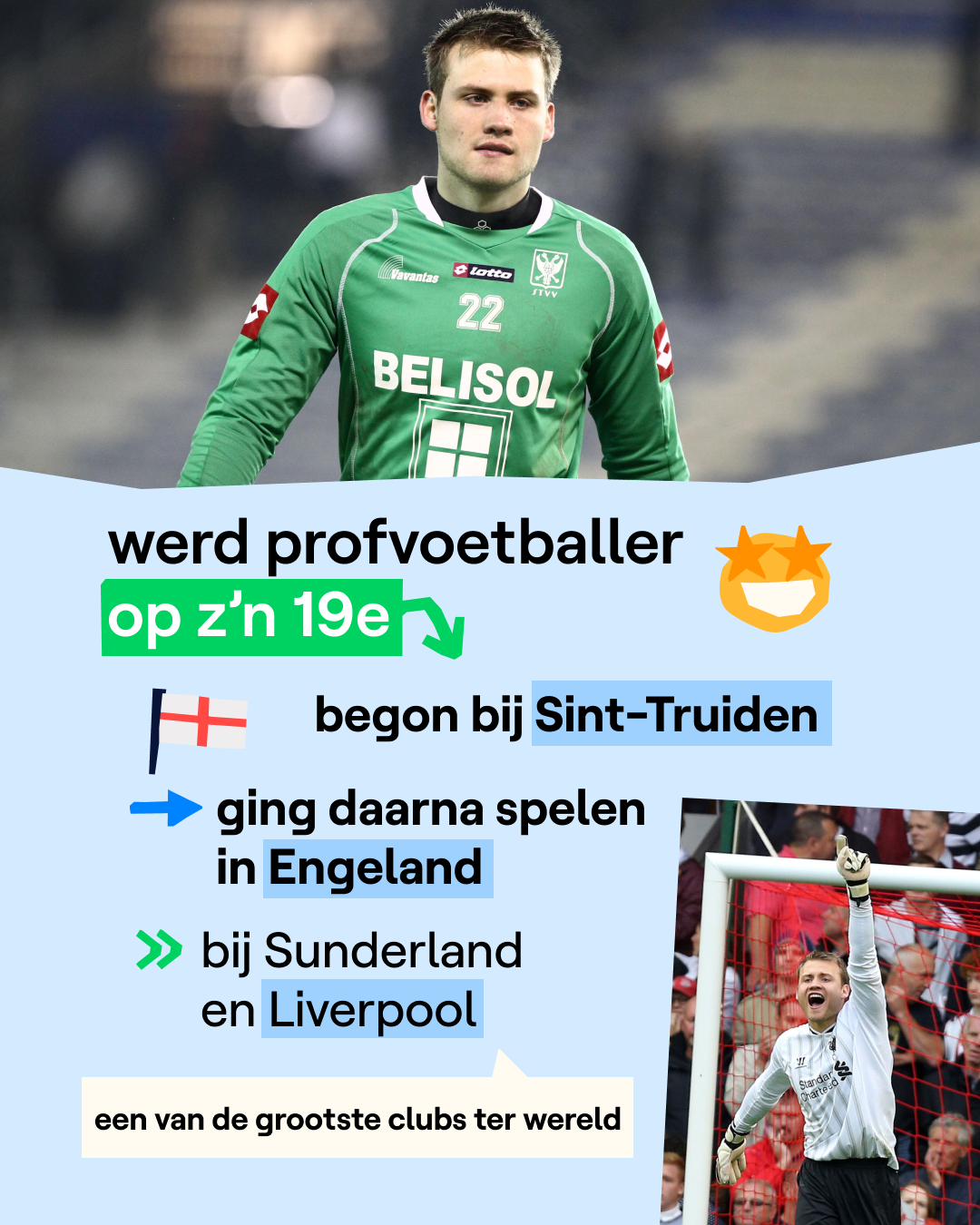 Simon Mignolet was in 2013 de eerste Belg ooit die een transfer maakte naar Liverpool. In zijn allereerste wedstrijd veroverde hij meteen de harten van de fans. Hij pakte toen een penalty in de laatste minuut van de match. In 2019 won Mignolet met Liverpool ook de Champions League, het allerbelangrijkste toernooi voor Europese clubs. Hij zat toen wel op de bank.