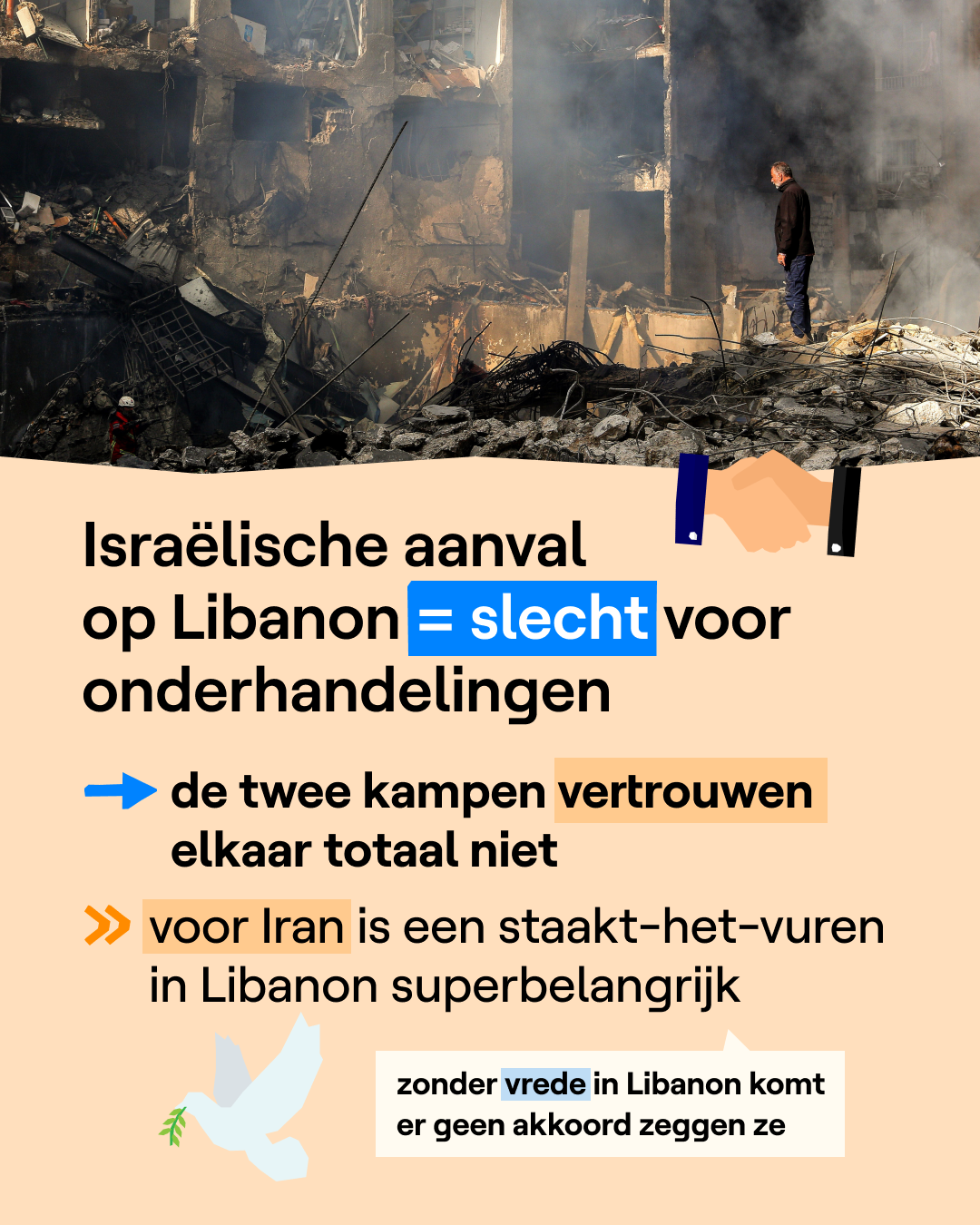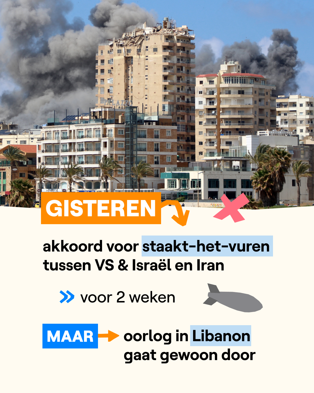 Volgens de Iraanse president zijn vredesonderhandelingen tussen de VS, Israël en Iran "zinloos" als de aanvallen op Libanon blijven doorgaan. Hij zegt dat Iran de Libanese bevolking niet in de steek wil laten. Ook Europese politici zijn erg kritisch voor de Israëlische aanvallen op Libanon. Volgens de Franse president Macron bijvoorbeeld is het noodzakelijk dat er ook daar een gevechtspauze komt.