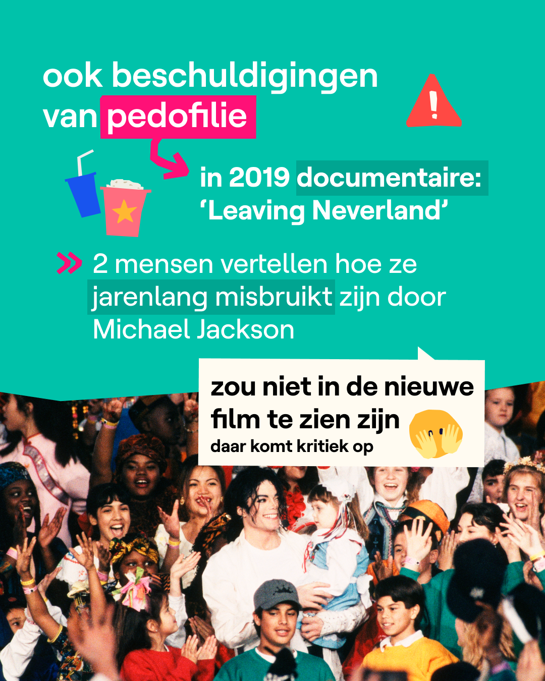 Michael Jackson. Het gaat nergens over het kindermisbruik waarvan hij beschuldigd wordt. Dat was eerst niet de bedoeling. In een vorige versie van de film zaten wel scenes over de beschuldigingen, maar na een deal met één van de slachtoffers zijn die eruit gehaald.