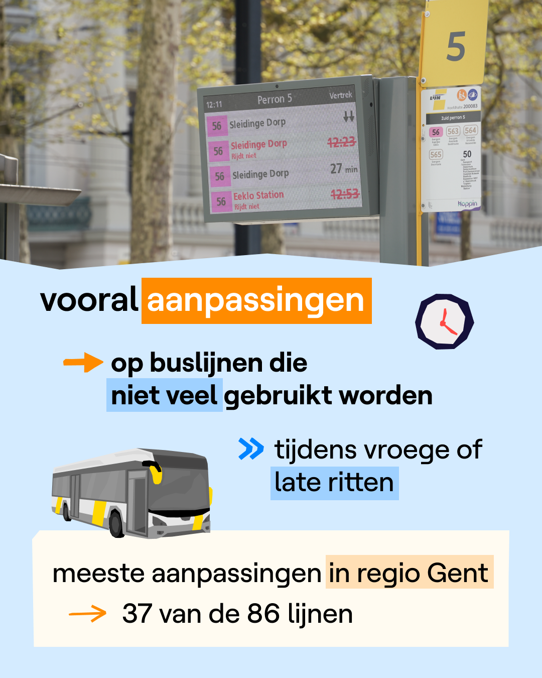 De aanpassingen zijn vooral op buslijnen die onvoldoende gebruikt werden, waaronder heel late of vroege ritten. Er worden ook verschillende buslijnen samengevoegd of de bussen zullen minder vaak rijden.