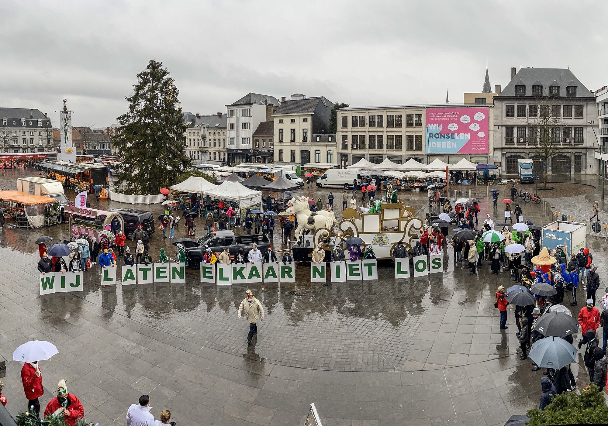 In Ronse is vandaag een zeer bescheiden Bommelsstoet door de centrumstraten getrokken. Leden van de verschillende Bommelsgroepen droegen letters mee die samen "Wij laten elkaar niet los" vormden. Corona en het regenweer waren (alweer) de grote spelbrekers dit jaar.