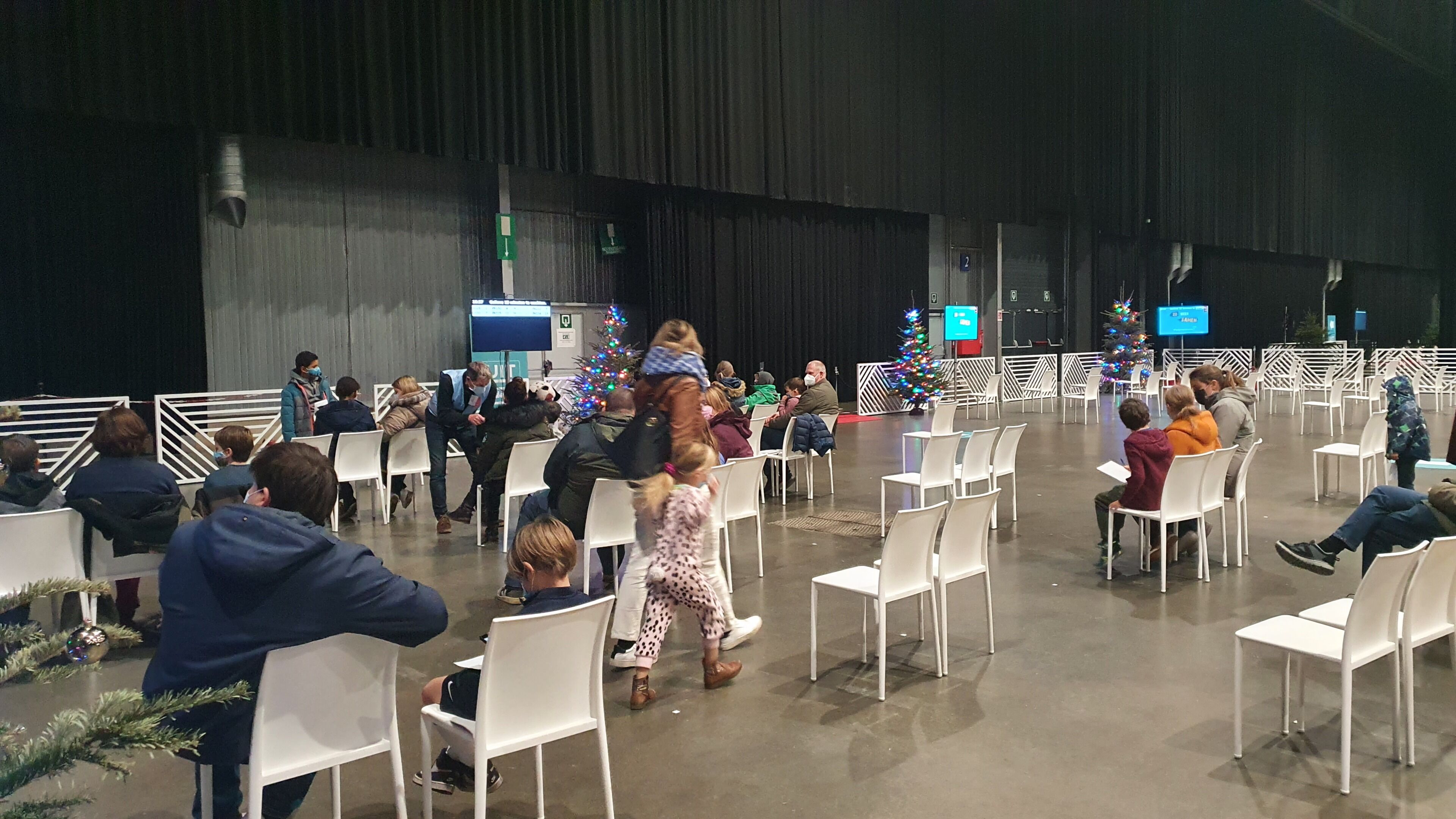 “We moeten de schermen en de kerstbomen nog tellen. En dan onze naam invullen”, vertellen een broer en zus die om hun vaccin komen. “Het zijn best gemakkelijke vragen als je een beetje oplet. Wat meten ze aan de inkom? Welke kleur heeft je wachtzaal? Hoeveel kerstbomen staan er?”
