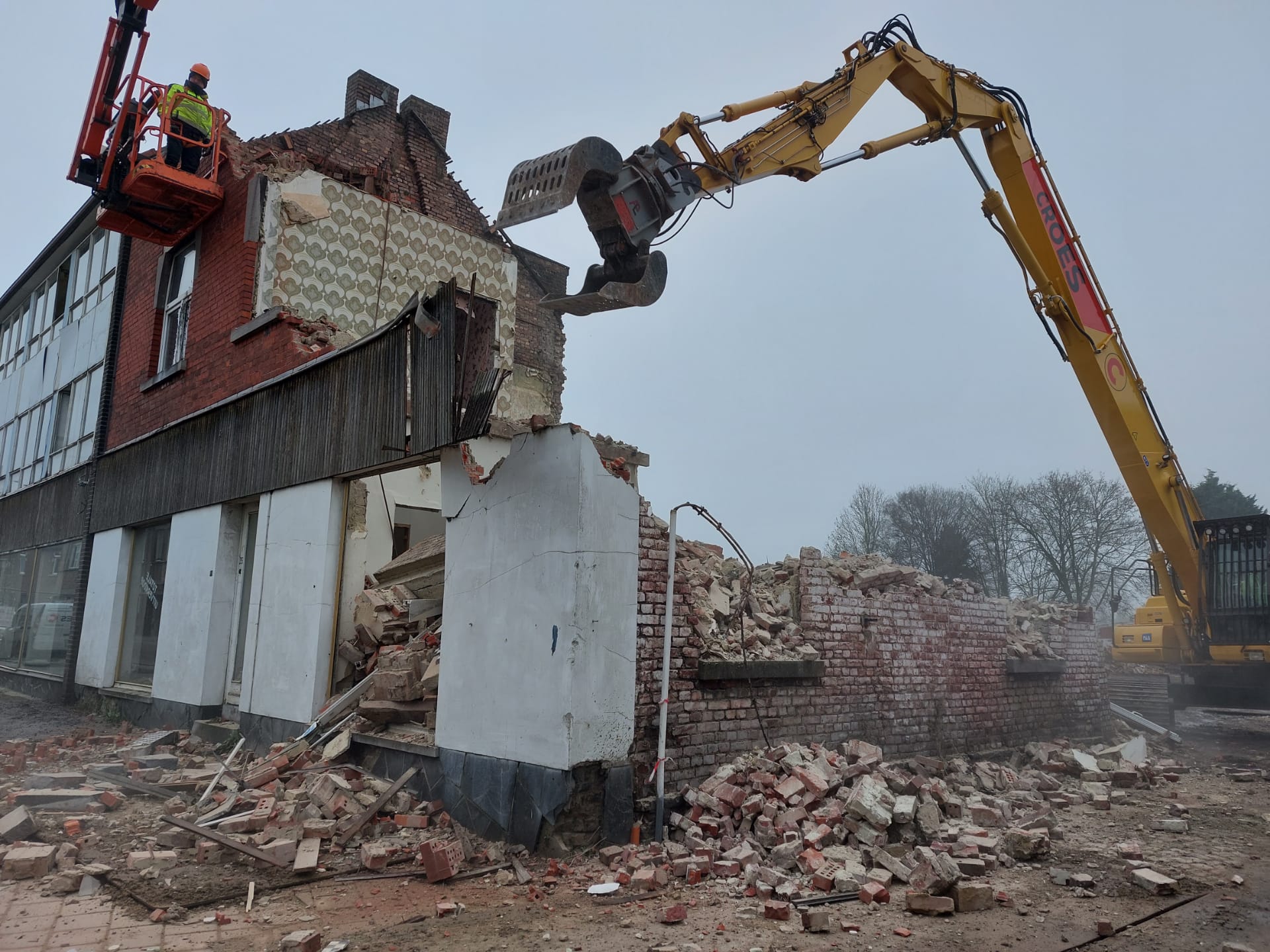 Van de sloop is momenteel nog weinig te merken. Een aannemer begon de sloop aan de achterkant van het gebouw, morgen wordt er pas aan de straatkant afgebroken. De sloop zal zo'n twee weken duren. Omdat de antiekzaak tegen een ander gebouw aanleunt, moet er nadien ook een nieuwe zijmuur gezet worden. Toch zal het nog tot de zomer duren vooraleer het hele perceel opgeruimd is. Pas dan kan er tegen de spoorwegtalud een laatste achterliggend gebouw afgebroken worden.