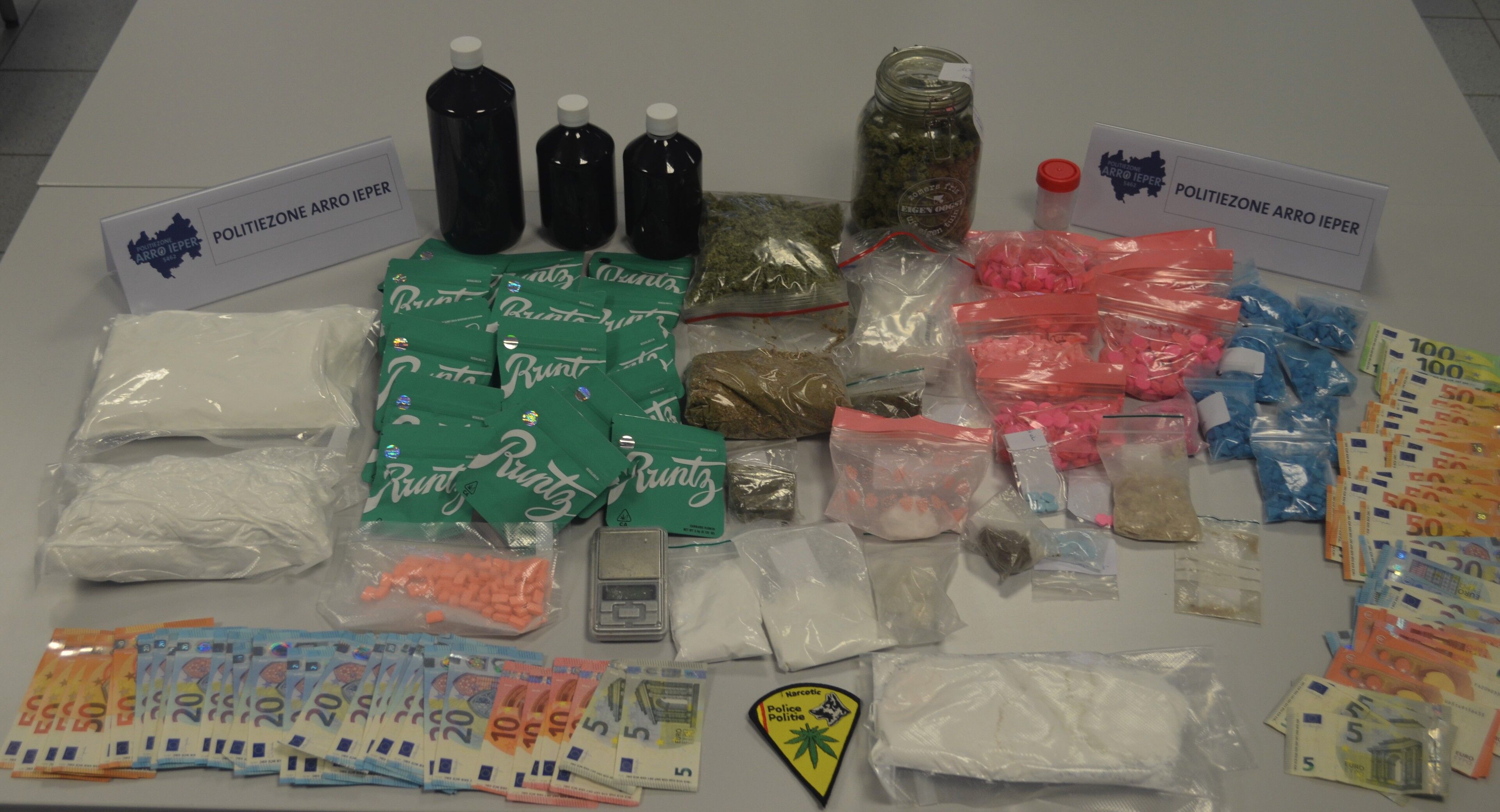 Dinsdagmiddag konden de lokale recherche en een team van de politiezone Arro Ieper een drugskoerier op heterdaad betrappen. Het onderzoek gebeurde in het kader van een lopend drugsdossier. De Nederlandse man uit Roosendaal kwam een Ieperse dealer aan huis bevoorraden. In het huis en in de wagen van de koerier werd een grote hoeveelheid drugs aangetroffen. In totaal gaat het om 2,5 kg speed, 1.800 tabletten xtc, een halve kilo cannabisproducten en nog enkele kleinere hoeveelheden van cocaïne, MDMA, ketamine en crystal meth, die samen met cash geld in beslag werden genomen.