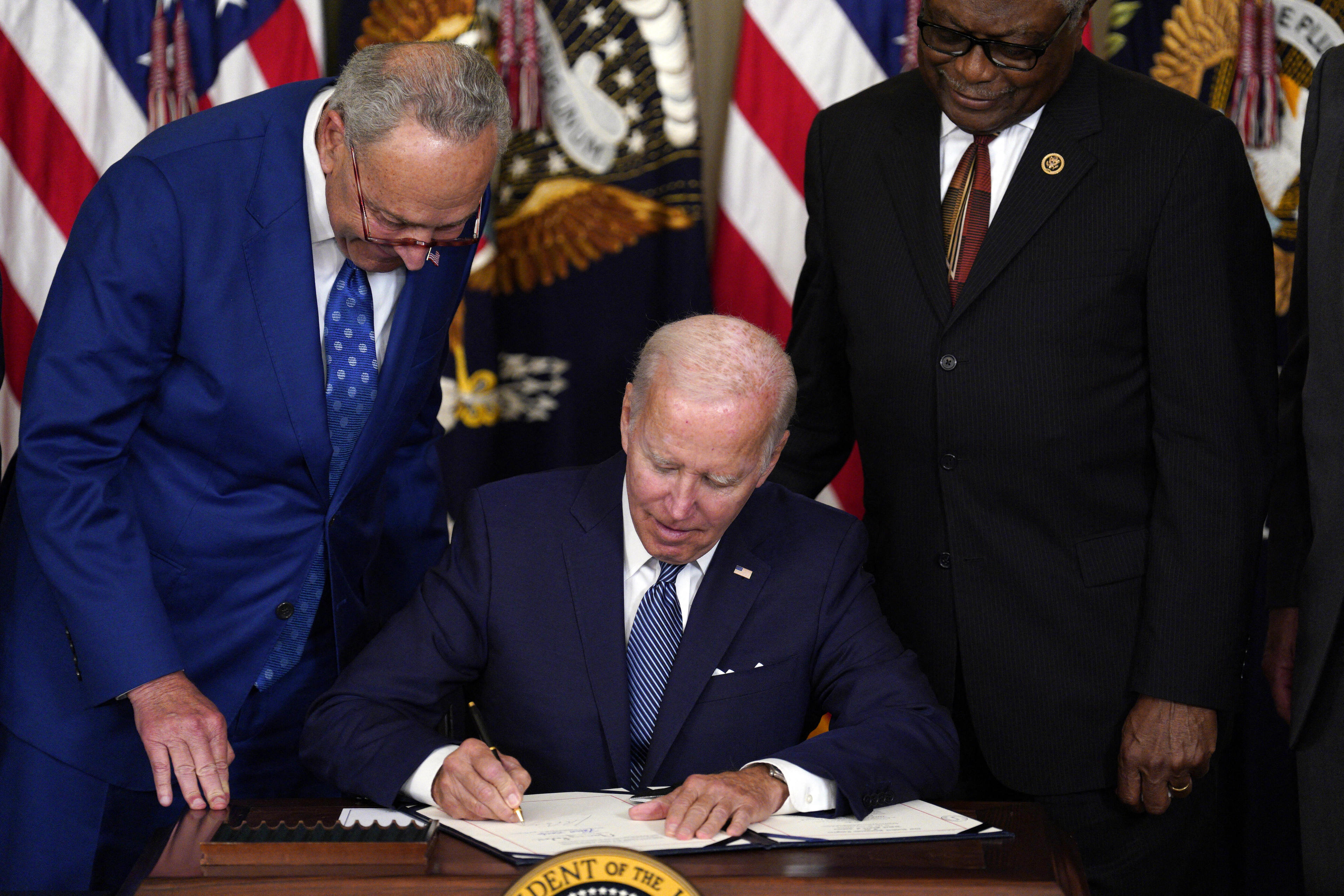 Het pakket is mede door verzet vanuit zijn eigen Democratische Partij afgezwakt, maar Biden tekende de wet omringd door klappende medewerkers met een grote glimlach.