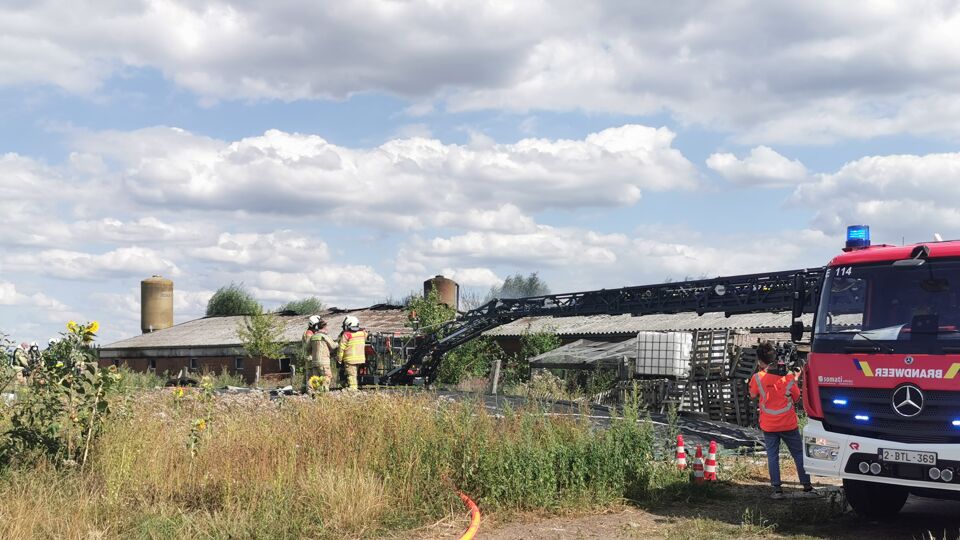 "We zien duidelijk dat dezelfde blikseminslag gelijktijdig op de toppen van de twee daken is ingeslagen", zegt brandweerkapiteit Marc Degrieck van brandweerpost Torhout. "De brand ontstond van boven naar beneden wat het voor ons moeilijker maakt om te blussen."
