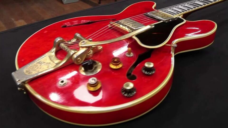 Muziek Kapotgeslagen tijdens ruzie en nu geveild voor 385.000 euro: het verhaal achter de rode gitaar van Oasis De rode Gibson-gitaar van Noel werd in 2009 backstage vernield na een zoveelste knallende ruzie. wo 18 mei 10:32